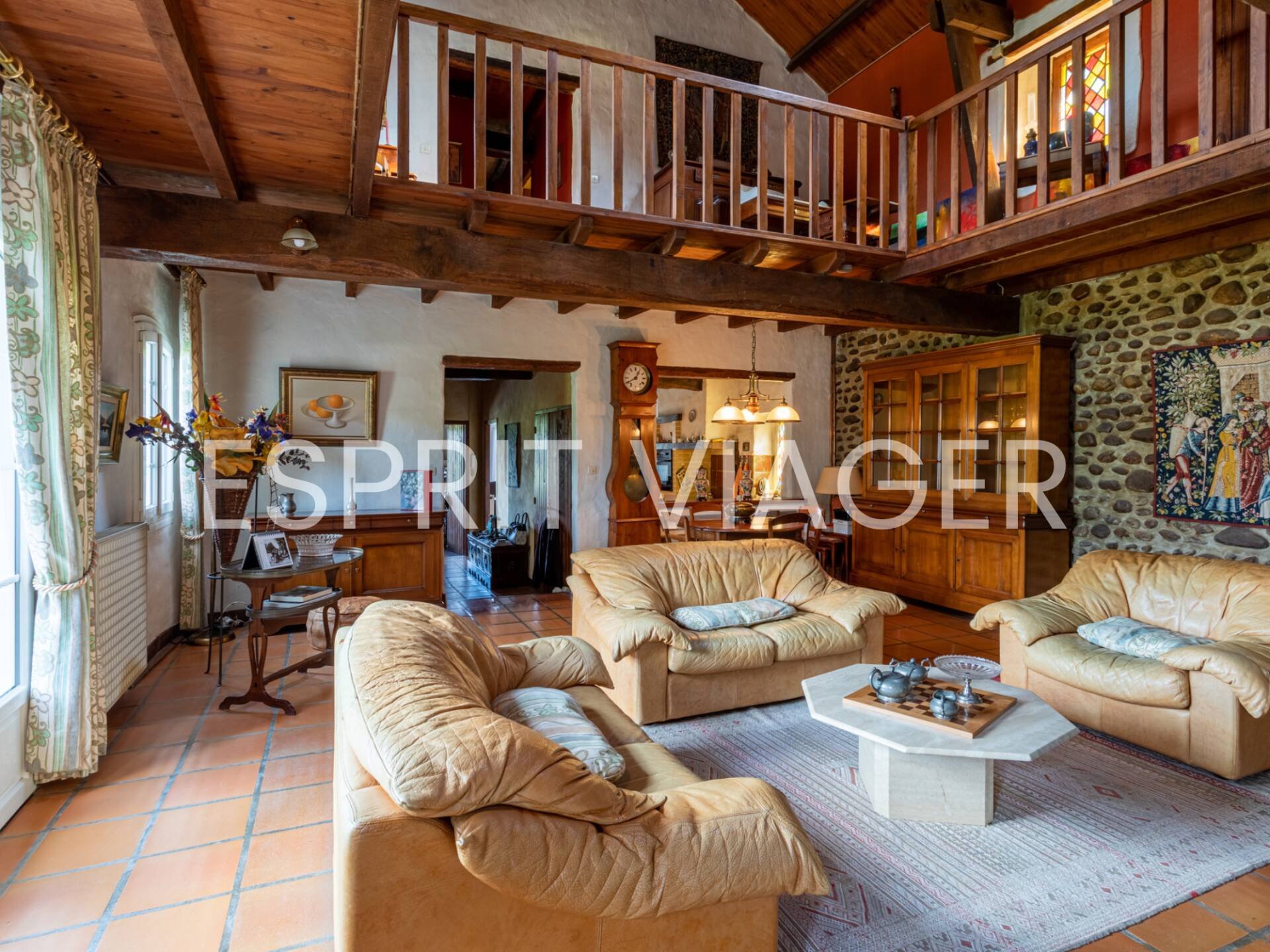 Propriété vendue en VENTE A TERME LIBRE à MONTANER (64). Située dans le Sud-Ouest de la France, appartenant au département des Pyrénées-Atlantiques, Montaner est un village où il fait bon vivre, situé à 8 km de Vic-en-Bigorre, 19 km de Tarbes et 36 km de Pau (47 minutes). A proximité des Pyrénées et de l'océan Atlantique, cette région est prisée et le tourisme en plein essor. Sur un terrain d’environ 4 450 m², entièrement clos, cette ancienne ferme construite à la fin du XIXème siècle a été entièrement rénovée avec goût et des matériaux de qualité. Bénéficiant d'une vue splendide sur la campagne et le château médiéval, cette jolie bâtisse en pierre d'une superficie de 265 m² se compose d'un hall d'entrée, d'une cuisine indépendante, de deux grands salons avec cheminées de plus de 40 m² chacun, une chambre, une buanderie et un WC. A l'étage, un grand palier avec vue plongeante sur le séjour distribue quatre grandes chambres, un bureau, une salle de bain, une salle d'eau et un WC. La toiture a été entièrement rénovée en 2023 (pose ardoises et gouttières). Attenant à la maison, vous trouverez un atelier et un double garage. Une grange indépendante et un cabanon de jardin viennent compléter le tout. Vous serez également séduit par son extérieur : un jardin arboré, une vue magnifique et une terrasse carrelée surplombant la piscine. La piscine au sel (10 x 5) dispose d'une alarme de déclenchement en cas de chute dans l'eau et d'une pompe à chaleur. Cette propriété se prête parfaitement pour accueillir une famille ou encore pour en faire un gîte et dégager des revenus. Ses atouts : son charme et son cachet (poutres apparentes, pierre de l'Adour), ses grands espaces, son entretien et l'absence de travaux, ses extérieurs et sa vue magnifique, ses dépendances, son calme, ses prestations : pompe à chaleur, cumulus thermodynamique. Montant estimé des dépenses annuelles d’énergie pour un usage standard entre 2 670€ et 3 650€ par an. Prix moyens des énergies indexés au 1er janvier 2021 (abonnements compris). Consommation énergétique C : 168 kWh/m²/an. Emission de gaz à effet de serre A : 5 kgCO2/m²/an. Réalisé le 07/04/2022. Les informations sur les risques auxquels ce bien est exposé sont disponibles sur le site Géorisques : www.georisques.gouv.fr. Notre agence ESPRIT VIAGER vous propose cette VENTE A TERME LIBRE avec versement de mensualités pendant 15 ans. En vente à terme libre, le vendeur n’a plus la jouissance de son bien, il perçoit seulement les mensualités jusqu’au terme défini dans le contrat. De ce fait, l’acquéreur dispose librement du bien pour y habiter ou le louer dès la signature de l’acte de vente. INFORMATIONS FINANCIÈRES : – Comptant : 35 000€ net vendeur soit 62 000€ honoraires d’agence inclus payable le jour de la signature de l’acte authentique. – Mensualités : 1 689€/mois pendant 15 ans. Mensualité indexée annuellement selon l'IRL. – Honoraires d’agence : 27 000€ TTC à la charge de l’acquéreur soit 7,96% calculés sur la valeur vénale du bien. – Valeur vénale : 339 000€ – Frais d’acquisition : 26 850€ – Taxe foncière annuelle : 1 307€. Réf mandat : 80 - Avenant 118